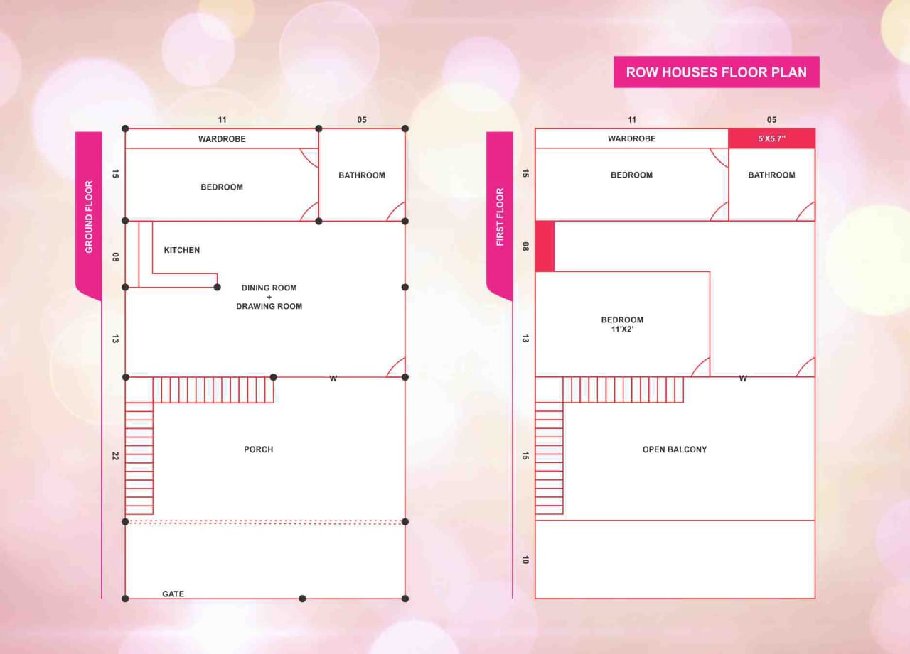 The Row Houses present at our project is of various sizes starting from 1000 Sq.Ft. to 4000 Sq.Ft. These Row Houses are of two Storeys/Duplex and being sold by multiplying area of both floors by 2000 Rs/ Sq.Ft. in which these Row Houses on an average consists of 3 Bed Room, 1 Hall/ Dining+ Drawing, Kitchen, 2 Bath Room, Porch and Lawn..