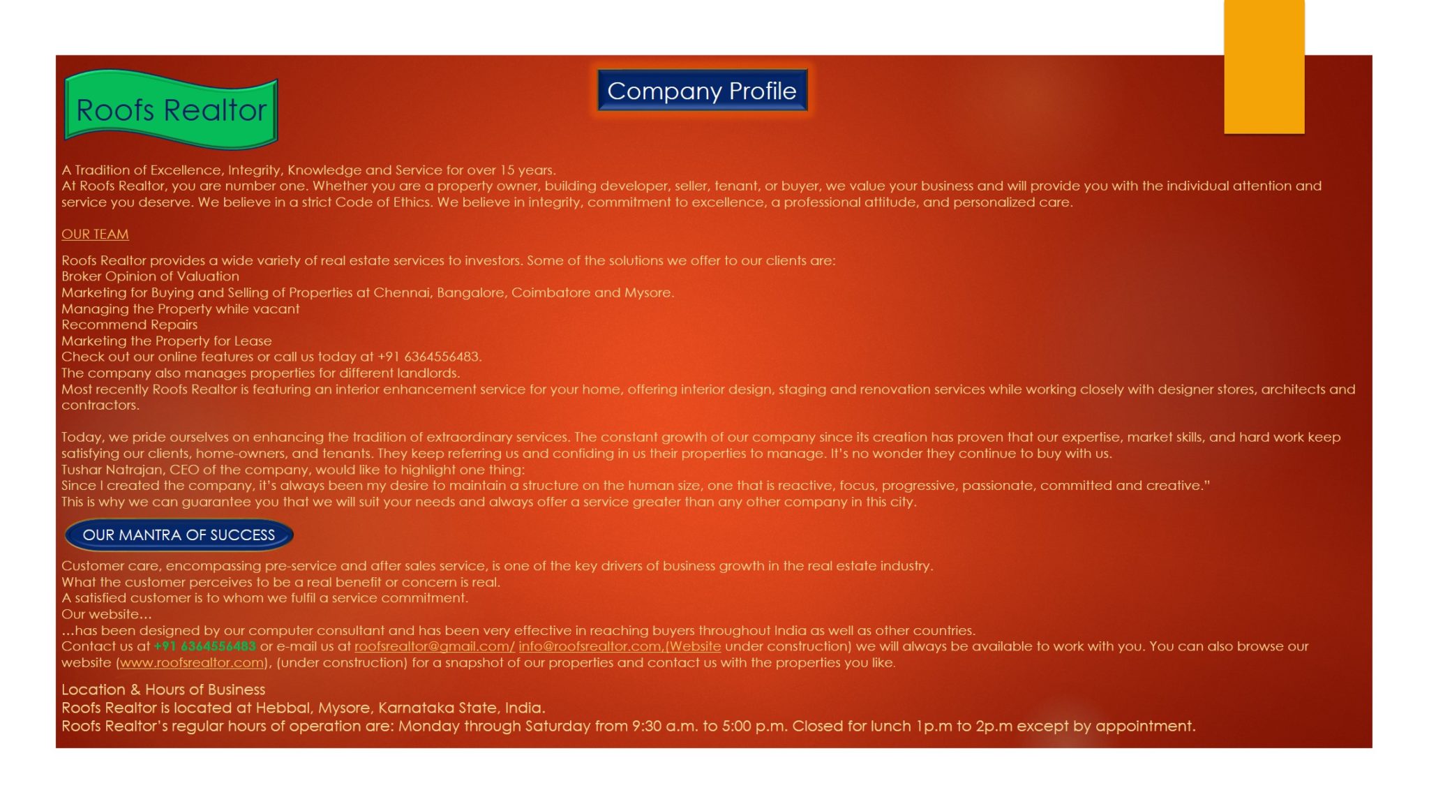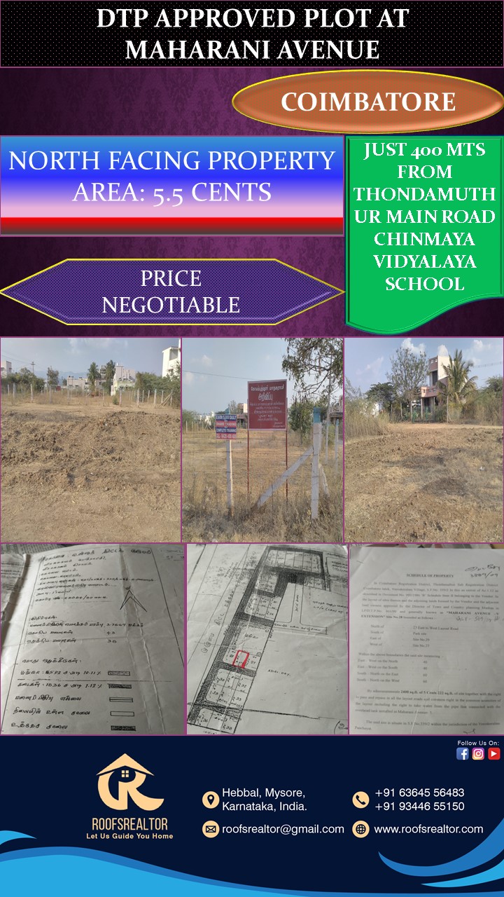 Roofs Realtor is based in Hebbal, Mysore and has set up an Internet-based real estate property which allows clients to examine various properties at once through the simple click of a mouse. We are a real estate company that offers commercial and residential real estate services to individuals and businesses in Chennai, Coimbatore, Bangalore, and Mysore.